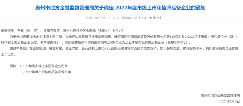 近日,泉州市地方金融監(jiān)督管理局公布2022年度泉州市上市和掛牌后備企業(yè)名單,確定120家企業(yè)為2022年度市級上市后備企業(yè)(其中科創(chuàng)板上市后備企業(yè)16家),293家企業(yè)為2022年度市級掛牌后備企業(yè)。